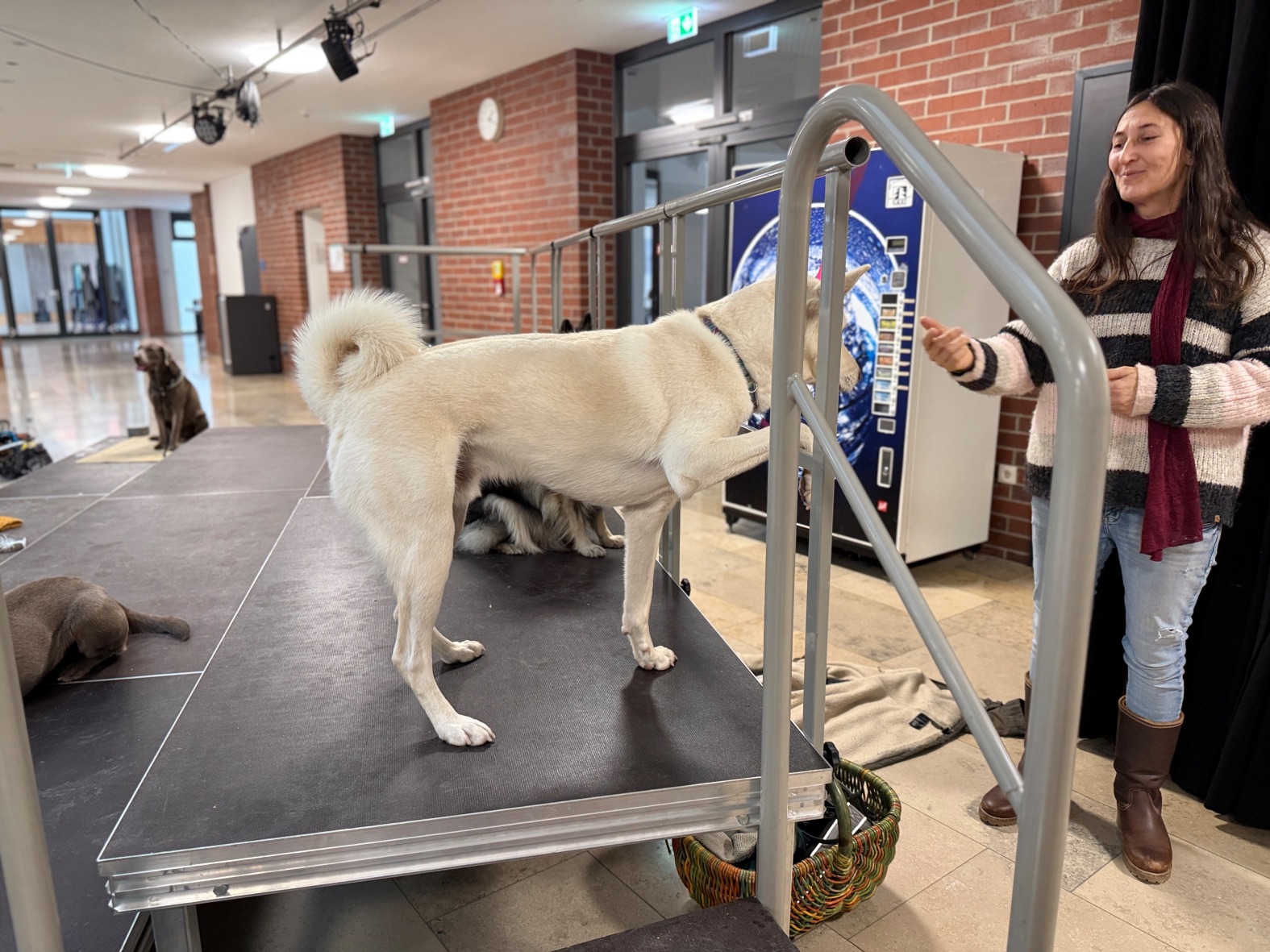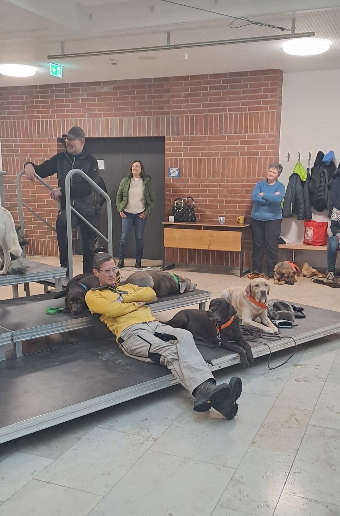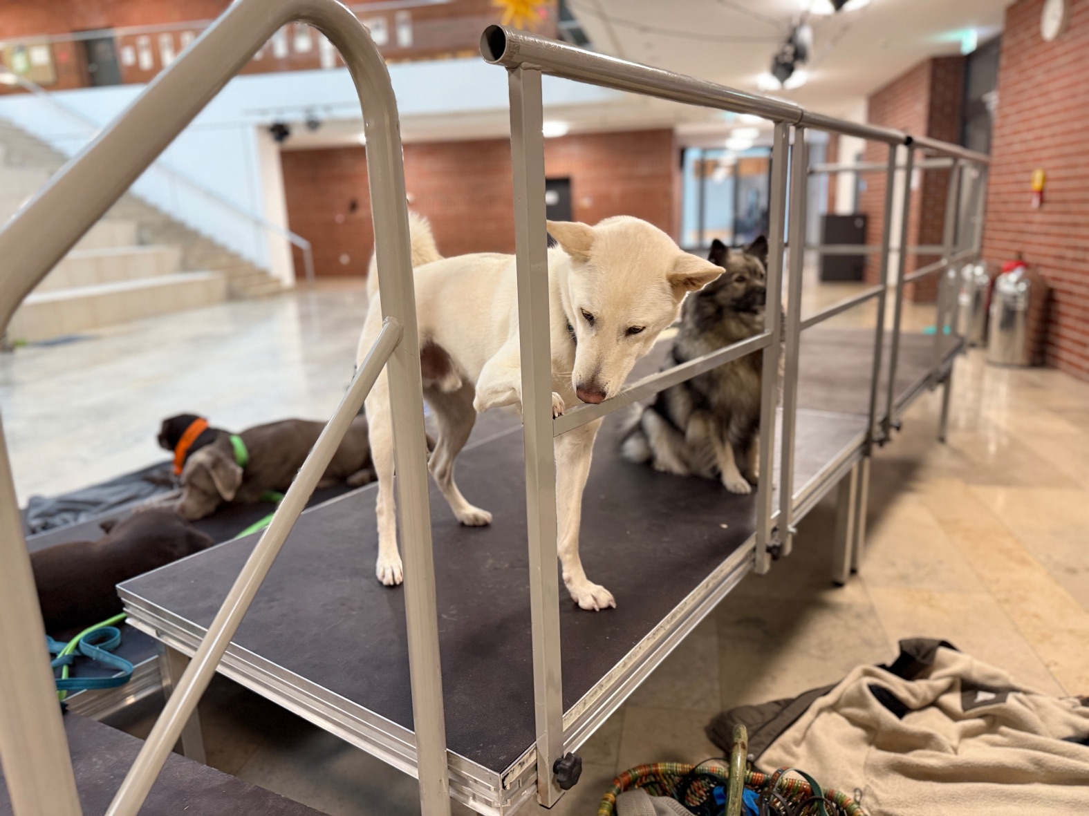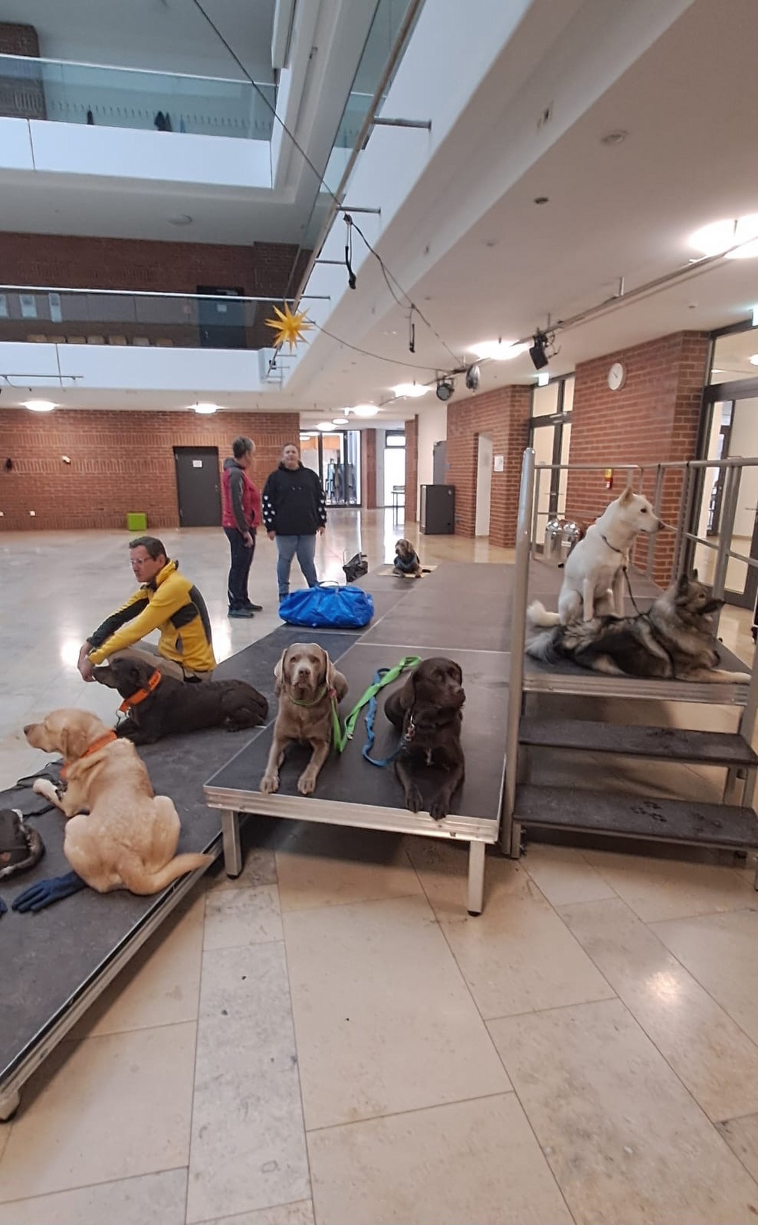 Aus unserer Erfahrung des Vorjahrs durften alle Teams, also auch alle Hunde in der großen Empfangshalle des Gymnasiums warten. So waren Mensch und Hund richtig gechillt.