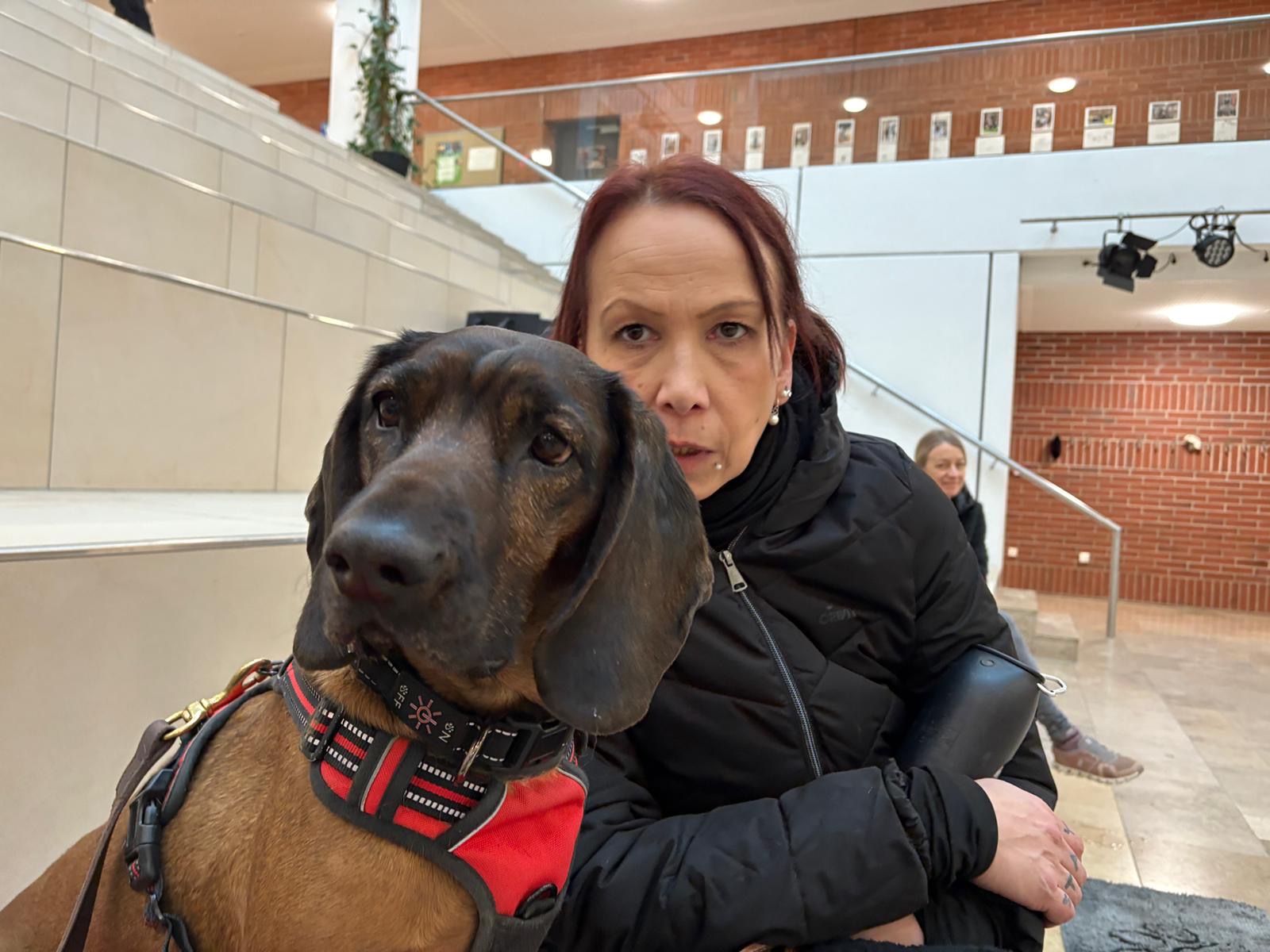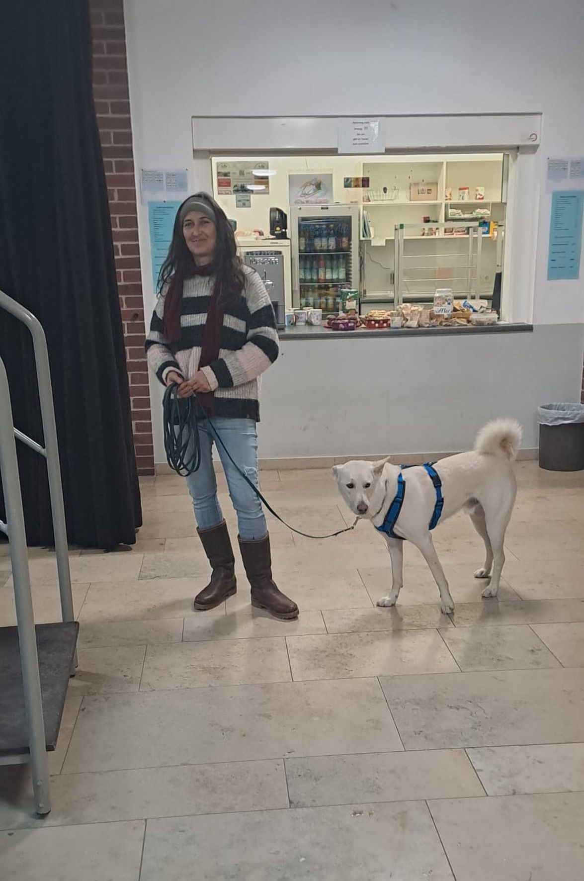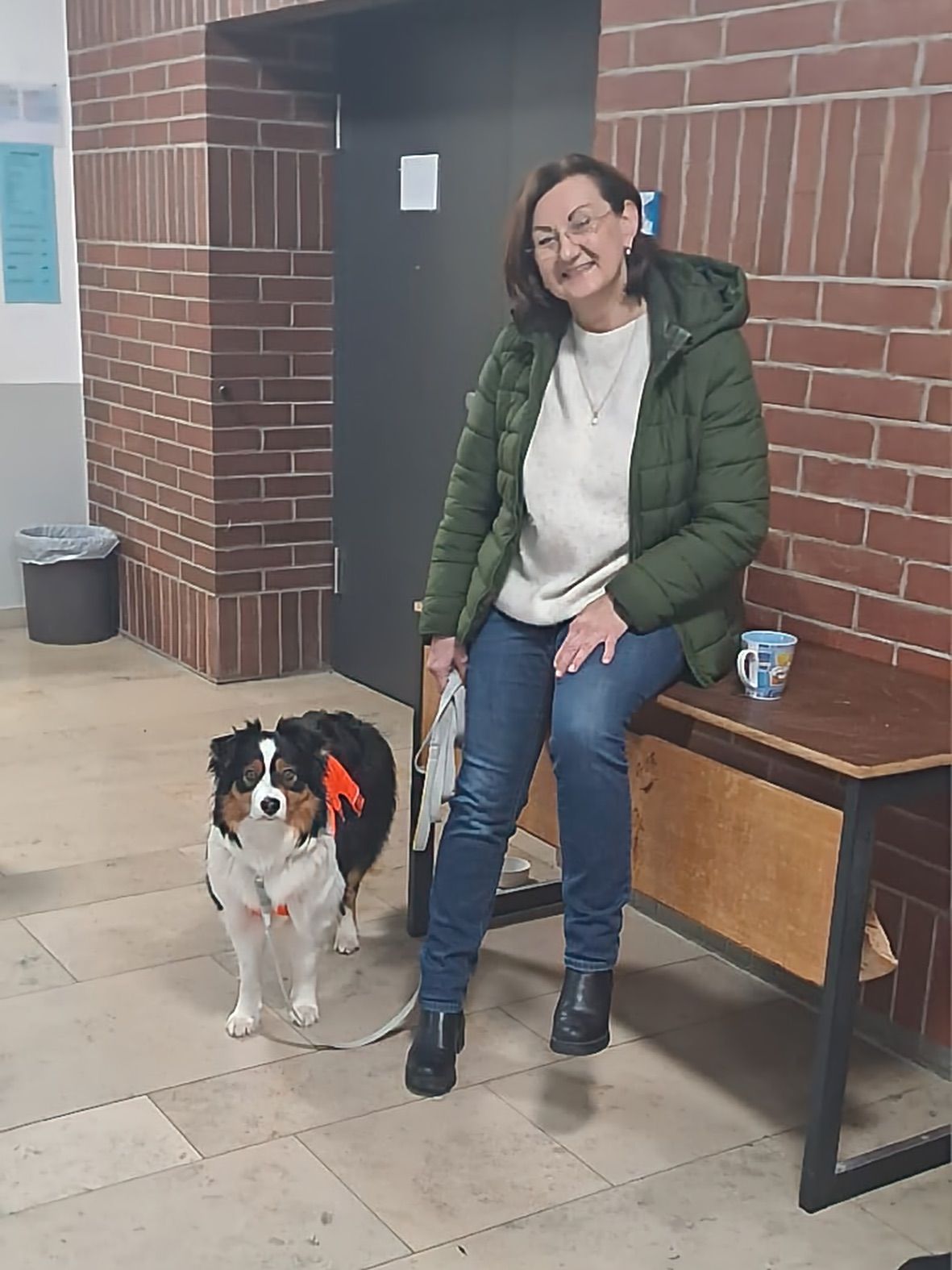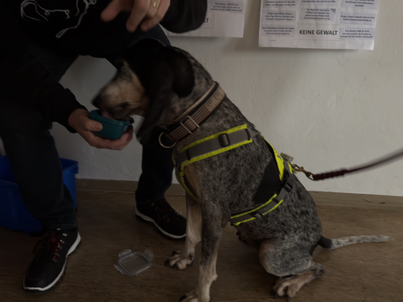 Aus unserer Erfahrung des Vorjahrs durften alle Teams, also auch alle Hunde in der großen Empfangshalle des Gymnasiums warten. So waren Mensch und Hund richtig gechillt.