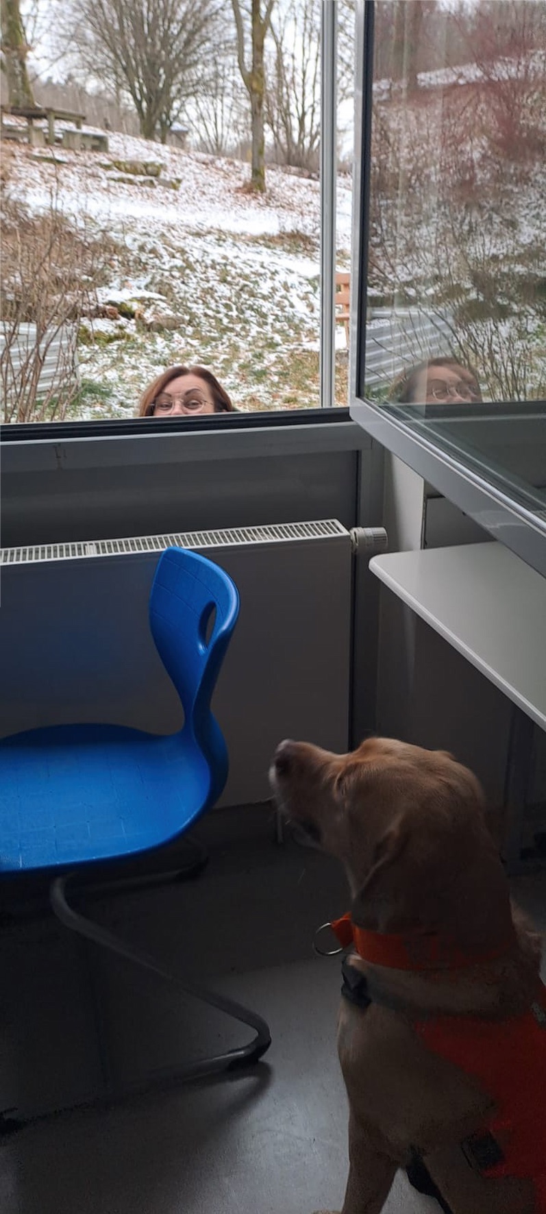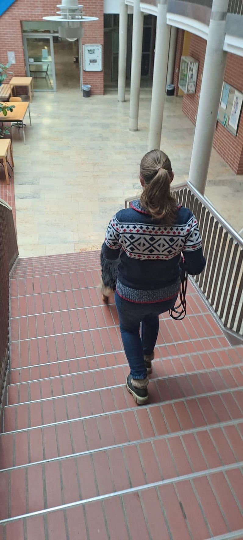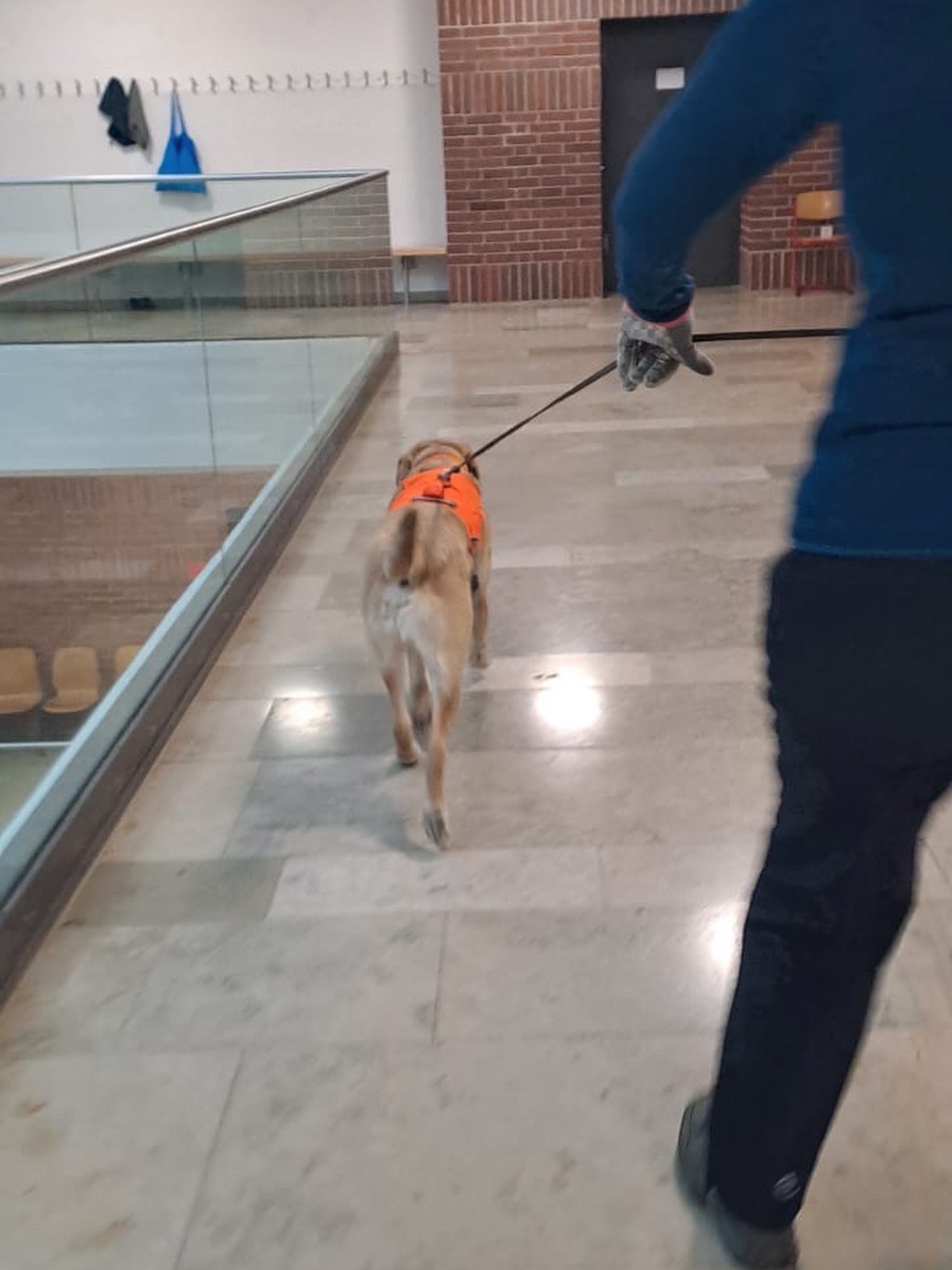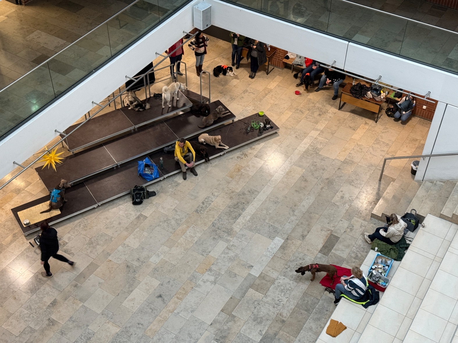 Aus unserer Erfahrung des Vorjahrs durften alle Teams, also auch alle Hunde in der großen Empfangshalle des Gymnasiums warten. So waren Mensch und Hund richtig gechillt.