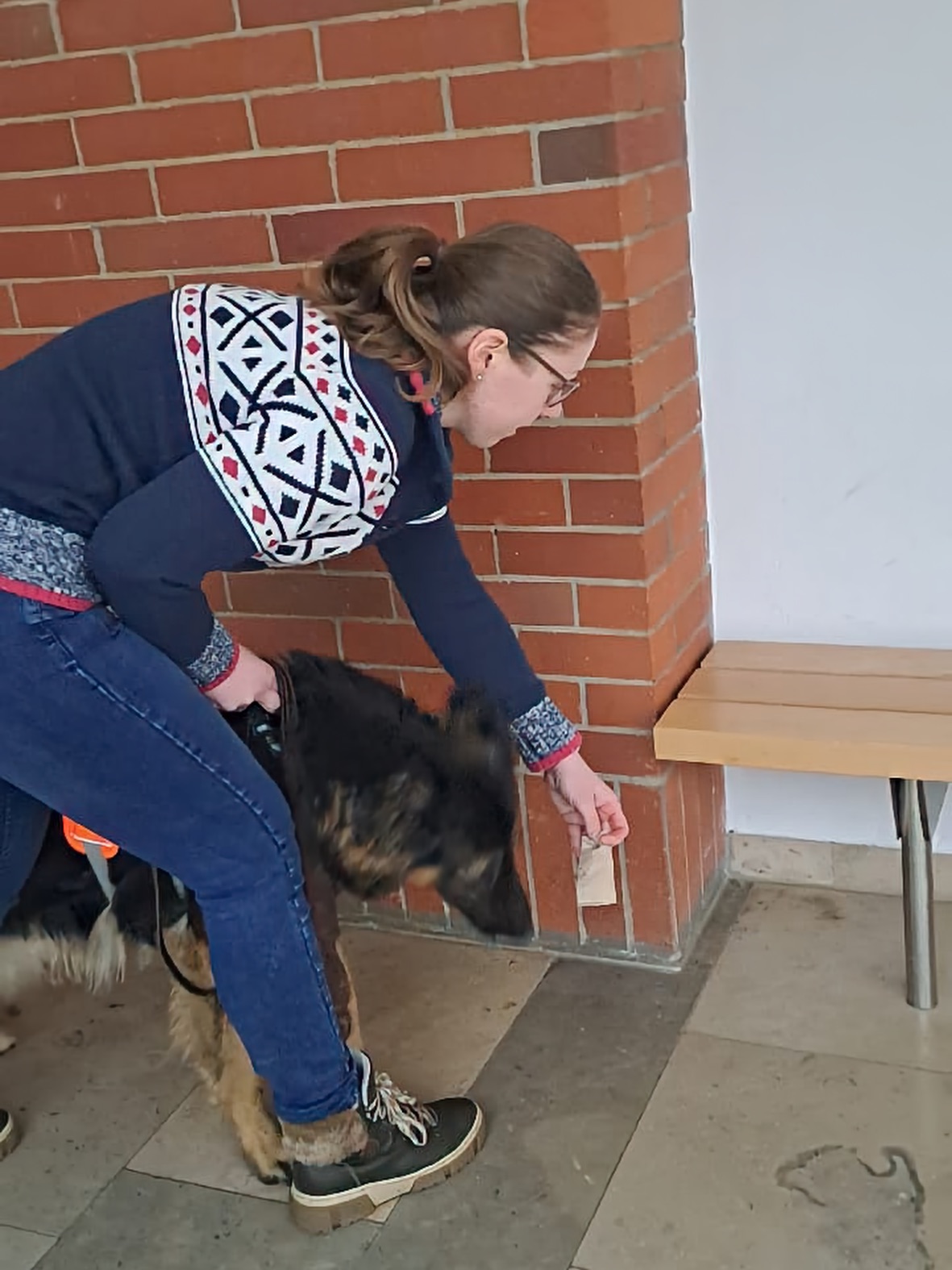 Wir hatten im wahrsten Sinne des Wortes alles Hände voll zu tun. Indoor-Anfängerteams durften von draußen in das Gymnasium hineintrailen. Da konnten sich die Hunde schon vorher auf die dort eindeutige Geruchsspur konzentrieren.